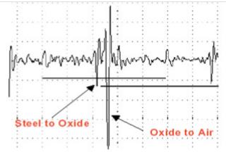 圖3中的示例示出了鋼-氧化物界面回波的振幅約為1/3的氧化物-空氣界面回波。 使用高阻尼“α”型橫波直探頭是獲得薄氧化層測量的關(guān)鍵。