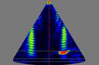 探針在螺栓上旋轉(zhuǎn)360°以致扇形掃描完全覆蓋螺紋。 左側(cè)圖顯示采用扇形掃查可以探測單個(gè)螺紋, 帶有缺陷區(qū)域的反射信號(hào)會(huì)顯著增加(紅色區(qū)域)