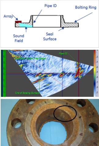 此示例從螺栓的表面展示了螺栓和法蘭墊片配置檢查。探頭位于螺栓孔之間且聲束穿透密封面和管子的內(nèi)徑。左邊的圖像展示了預(yù)想的扇形掃描結(jié)果和并呈現(xiàn)了腐蝕面從內(nèi)徑開始向密封墊圈延伸。第三張圖片上的圓圈顯示了檢測到的表面腐蝕。一旦密封墊圈接觸到密封面則被認(rèn)為已經(jīng)損壞,需要更換。