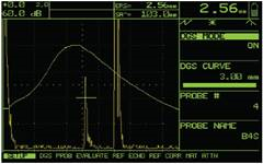 lDGS(距離增益尺寸)選項顯示了特殊等效參考缺陷尺寸曲線,作為測量25個窄頻探頭從探頭到參考缺陷距離的功能。ERS(等效參考缺陷尺寸)功能可自動計算測量門內(nèi)任何回波的相應(yīng)等效參考缺陷的直徑(單位為毫米或英寸)。